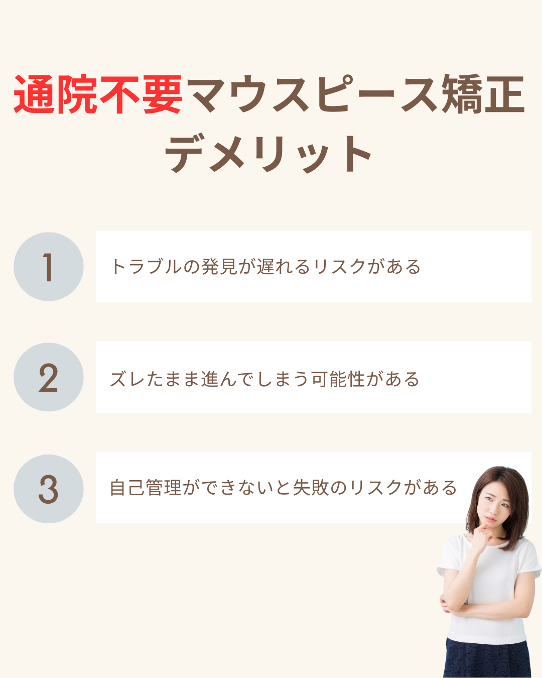 もし、マウスピース矯正での失敗を避けたいのであれば、「通院不要」のマウスピース矯正は選ばないことをおすすめします。